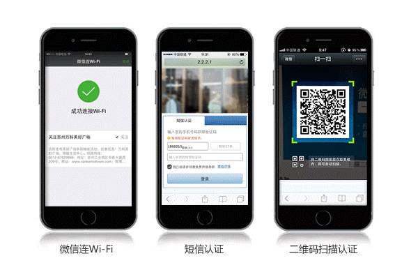 微信认证、二维码审核认证、短信认证等多种认证方式可选择,访客认证简单快捷;
